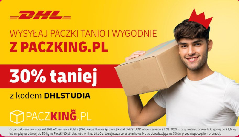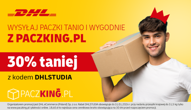 Organizatorem promocji jest DHL eCommerce Polska (DHL Parcel Polska Sp. z o.o.) Rabat DHLSTUDIA obowiązuje do 31.01.2026 r. przy nadaniu przesyłki krajowej do 31,5 kg tylko na PaczKING.pl i płatności online. 18,60 zł to najniższa cena cennikowa brutto obowiązująca na 30 dni przed rozpoczęciem promocji.